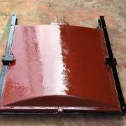 3、閘門體一般采用面板與加強(qiáng)肋的結(jié)構(gòu),面板可做平面或拱形。門體一般整體鑄造和機(jī)加工,但尺寸較大的可采用分塊組成式。門體上一般采用整體式金屬止水,兼作支承滑塊,金屬止水用同材料制作的沉頭螺釘緊固在門體上,螺釘頭部與止水工作面一起精加工,一些尺寸較大的也可“P”形橡皮止水。
